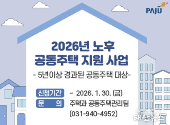 태산뉴스 이동욱 기자 | 파주시는 노후 공동주택의 안전성과 주거환경 개선을 위해 녪년 노후 공동주택 시설물 보수 및 소규모 공동주택 유지관리 지원 사업’과 함께 ‘청소노동자 휴게시설 신청 지원 사업’을 추진한다고 밝혔다.