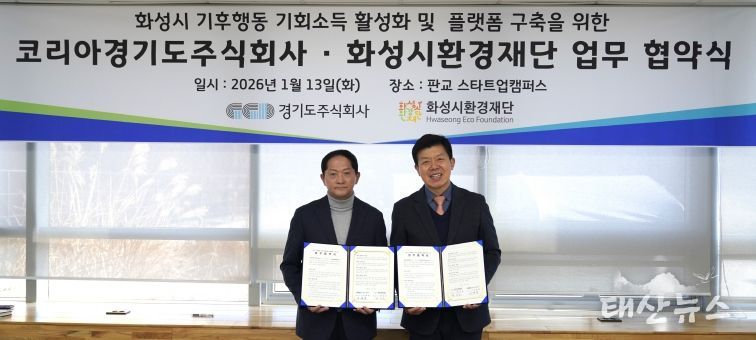 태산뉴스 김준수 기자 | 경기도주식회사는 13일 경기도 성남시 판교 스타트업캠퍼스에서 화성시환경재단과 ‘기후행동 기회소득 활성화 및 화성시 플랫폼 구축을 위한 업무협약’을 체결했다.