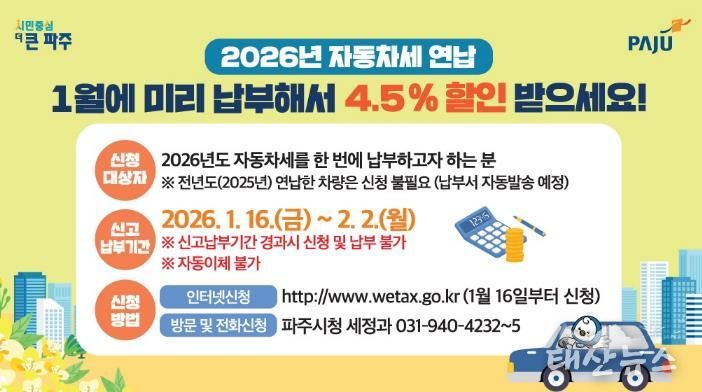 태산뉴스 이동욱 기자 | 파주시는 2026년도 자동차세를 1월에 한 번에 납부하는 경우 세액공제 혜택을 받을 수 있는 자동차세 연납 신청·납부를 2월 2일까지 접수한다고 밝혔다.