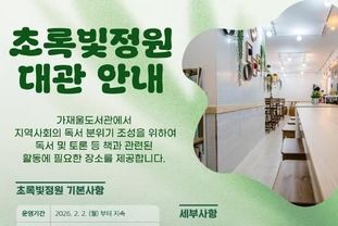 태산뉴스 이동욱 기자 | 의정부가재울도서관은 시민들의 독서 및 토론 활동을 지원하기 위해 도서관 공간인 ‘초록빛정원’을 2월 2일부터 예약자에 한해 개방한다.