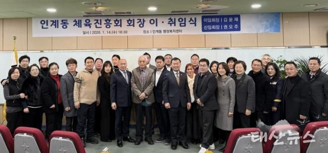 태산뉴스 이동욱 기자 | 수원시 팔달구 인계동 체육진흥회는 지난 14일, 인계동 행정복지센터에서 주요 내빈과 관계자 등 50여 명이 참석한 가운데 ‘인계동 체육진흥회장 이‧취임식’을 성황리에 개최했다.