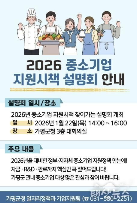 태산뉴스 이동욱 기자 | 가평군이 관내 중소기업의 경영 안정과 경쟁력 강화를 위해 새해 정부의 지원시책을 한자리에 모아 안내하는 설명회를 연다.