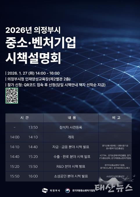 태산뉴스 이동욱 기자 | 의정부시는 1월 27일 시청 인재양성교육장에서 ‘2026년 중소‧벤처기업 시책설명회’를 개최한다.