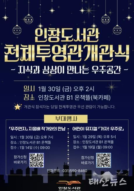 태산뉴스 이동욱 기자 | 구리시는 오는 1월 30일 오후 2시 인창도서관 지하 북카페에서 주요 내빈이 참석한 가운데 4층 야외에 조성된 인창도서관 천체투영관 개관식을 개최한다고 밝혔다.