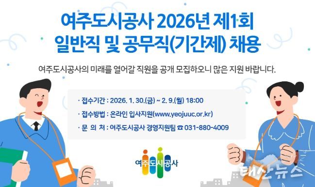 태산뉴스 이동욱 기자 | 여주도시공사는 공사의 지속 가능한 성장과 공공서비스 품질 향상을 위해 2026년 제1회 일반직 및 공무직, 기간제 직무중심 채용을 실시한다고 밝혔다.