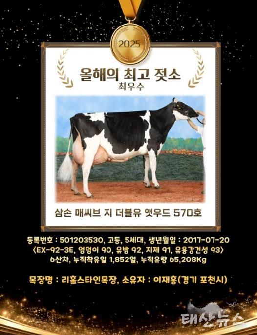 태산뉴스 이동욱 기자 | 포천시는 관내 낙농농가인 리홀스타인목장(대표 이재홍)이 2025년 ‘올해의 최고 젖소’를 배출했다고 밝혔다.