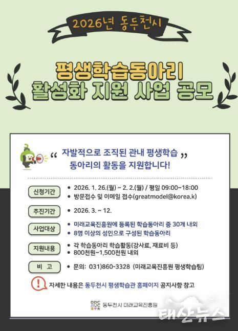 태산뉴스 이동욱 기자 | 동두천시는 오는 1월 26일부터 2월 2일까지, 시민 주도형 평생학습 문화 확산을 위해 ‘2026년 평생학습 동아리 활성화 지원사업’에 참여할 학습동아리를 모집한다고 밝혔다.