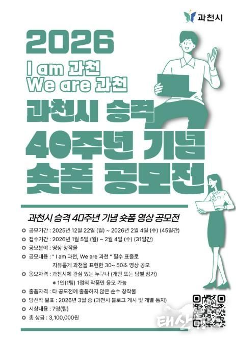 태산뉴스 이동욱 기자 | 과천시는 시 승격 40주년을 맞아 ‘숏폼 영상 공모전’을 개최하고, 오는 2월 4일까지 작품을 모집한다고 밝혔다.