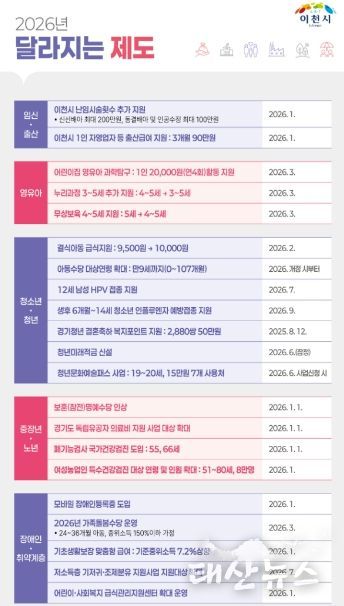 태산뉴스 이동욱 기자 | 이천시가 2026년 새해를 맞아 시민 생활과 밀접한 달라지는 제도를 발표했다.