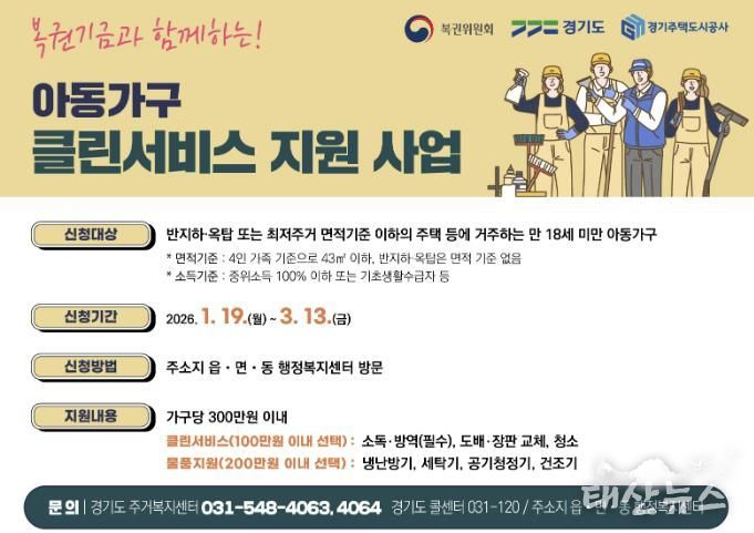 태산뉴스 이동욱 기자 | 의왕시가 복권기금과 함께하는 경기도 ‘아동가구 클린서비스 지원사업’의 신청을 1월 19일부터 3월 13일까지 받는다.
