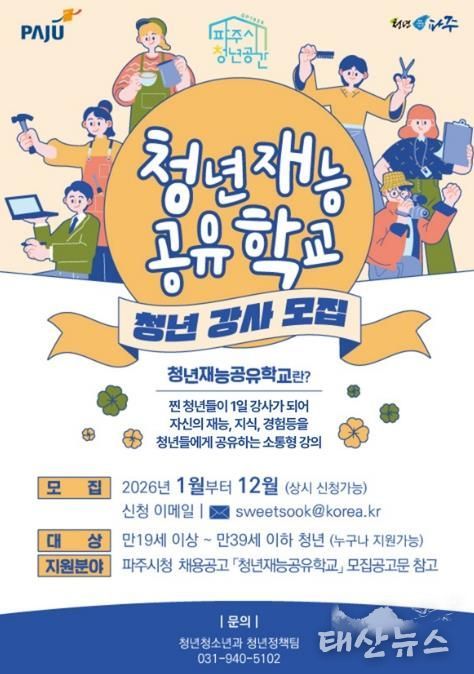 태산뉴스 이동욱 기자 | 파주시는 2026년 1월부터 12월까지 청년을 대상으로 '청년재능공유학교' 청년강사를 연중 상시 모집한다.