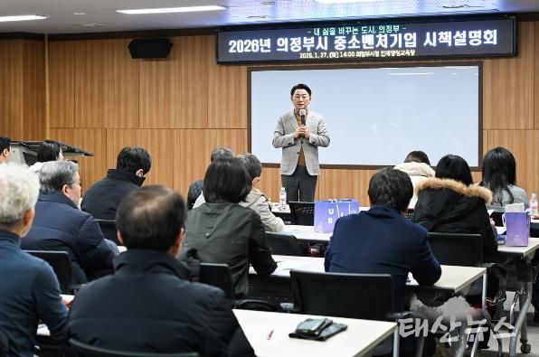 태산뉴스 이동욱 기자 | 의정부시는 1월 27일 인재양성교육장에서 관내 기업인과 유관기관 관계자 등 100여 명이 참석한 가운데 ‘2026년 중소‧벤처기업 시책설명회’를 개최했다.
