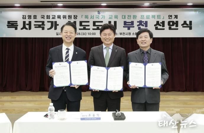 태산뉴스 이동욱 기자 | 부천시는 지난 28일 부천시청 소통마당에서 국회 교육위원회, 부천교육지원청과 함께 ‘독서국가 선도도시 부천 업무협약’을 체결하고, 김영호 국회 교육위원장의 ‘독서국가 교육 대전환 정책’과 연계한 ‘독서국가 선도도시 부천 선언식’을 개최했다. 이날 행사에는 김 위원장을 비롯해 교육계·도서관 관계자, 시민 등이 참석했다.