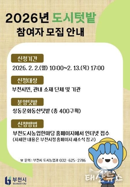 태산뉴스 이동욱 기자 | 부천시는 시민들이 텃밭 가꾸기를 통해 농업을 체험하고 자연과 공존하는 도시환경을 조성할 수 있도록 ‘2026년 도시텃밭’ 참여자를 모집한다.