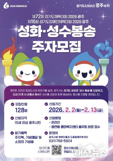 태산뉴스 이동욱 기자 | 광주시는 ‘제72회 경기도체육대회 및 제16회 경기도장애인체육대회 2026 광주’ 개최를 앞두고 성화·성수 봉송 주자를 모집한다고 2일 밝혔다.