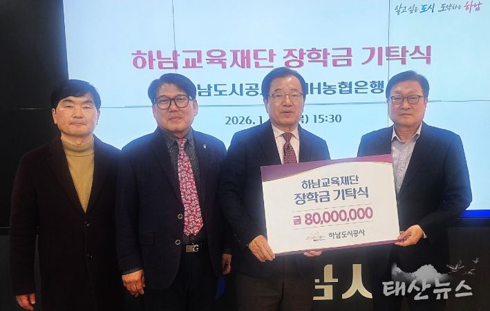 태산뉴스 이동욱 기자 | 하남교육재단은 29일 하남시청에서 하남도시공사로부터 하남시 미래인재육성을 위해 장학금과 캠퍼스투어 운영을 위한 기부금 8천만 원을 전달받았다.