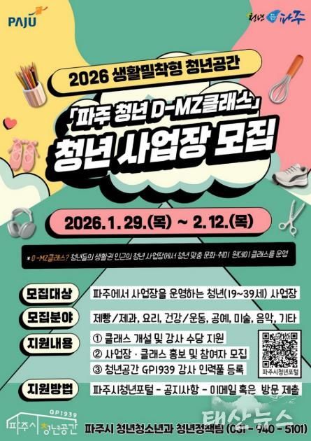 태산뉴스 이동욱 기자 | 파주시가 지역 청년이 운영하는 사업장을 활용해 청년 대상 문화·취미 프로그램을 운영하는 2026 생활밀착형 청년공간, ‘파주 청년 디(D)-엠지(MZ)클래스’에 참여할 청년사업장을 모집한다.