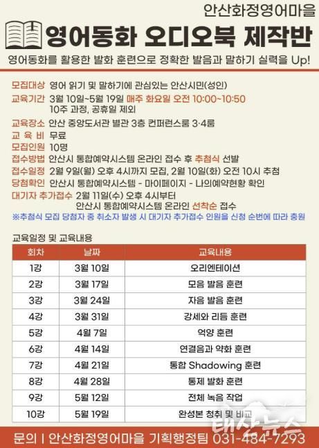태산뉴스 이동욱 기자 | 안산시가 설립하고 안산대학교가 운영하는 안산화정영어마을이 성인 영어 학습자를 위한 ‘영어동화 오디오북 제작반’을 3월부터 5월까지 10주 과정으로 안산시 중앙도서관에서 운영한다고 4일 밝혔다.