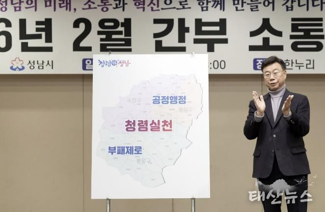 태산뉴스 이동욱 기자 | 성남시는 4일 오전 8시 간부소통회의에서 신상진 시장을 비롯해 4급 이상 간부공무원과 출자·출연기관 대표들이 참석한 가운데 청렴 실천 의지를 다지는 ‘청렴실천서약식’을 진행했다.