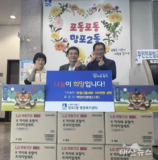 이용태 망포2동장은 “명절을 앞두고 소외감을 느끼기 쉬운 이웃들을 위해 따뜻한 나눔을 실천해 주신 백양티앤에스(주)에 깊이 감사드린다”며 “기탁해 주신 물품은 도움이 필요한 이웃들에게 소중히 전달하겠다”고 전했다.