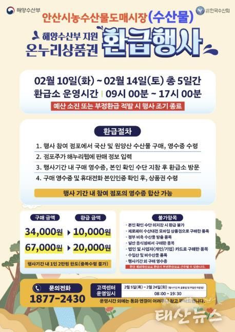 태산뉴스 이동욱 기자 | 안산시는 설 명절을 맞아 국산 수산물 소비 촉진과 도매시장 활성화를 위해 오는 10일부터 14일까지 5일간 ‘2026년 설 온누리상품권 환급행사’를 개최한다고 5일 밝혔다.