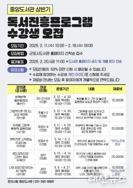 태산뉴스 이동욱 기자 | 군포시 중앙도서관은 다가오는 3월 시민들의 독서역량 개발과 지속적인 독서활동을 고취하기 위해 상반기 독서진흥프로그램을 운영한다.