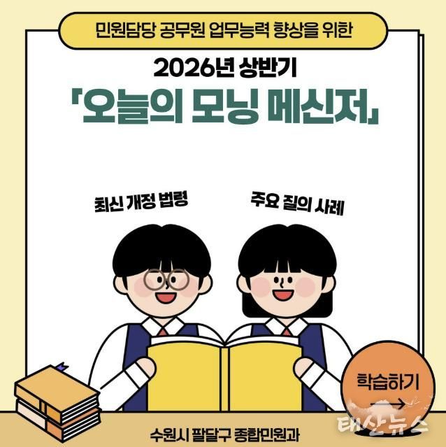 김미라 팔달구 종합민원과장은 “매일 아침 짧은 시간을 투자한 꾸준한 직무 학습이 시민들에게 더욱 정확하고 친절한 행정서비스를 제공하는 밑거름이 될 것”이라며, “앞으로도 직원들의 민원 대응 역량을 강화해 시민이 체감할 수 있는 만족도 높은 구정을 펼쳐 나가겠다”라고 전했다.