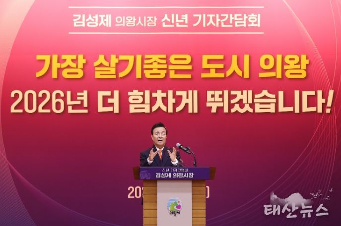 태산뉴스 이동욱 기자 | 김성제 의왕시장이 5일 시청 대회의실에서 2026년 신년 기자간담회를 열고 민선8기 의왕시 주요성과와 2026년 시정 운영방향에 대해 설명하는 시간을 가졌다.