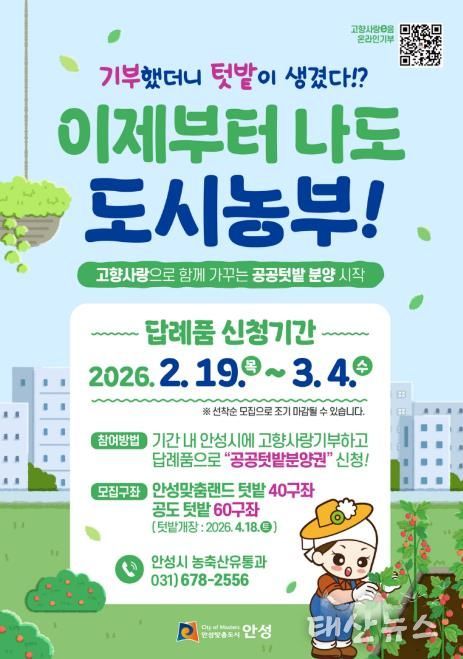 태산뉴스 이동욱 기자 | 안성시는 오는 2월 19일부터 고향사랑기부제를 통해 도시농업을 체험하는 ‘도시농부’를 모집한다고 밝혔다.