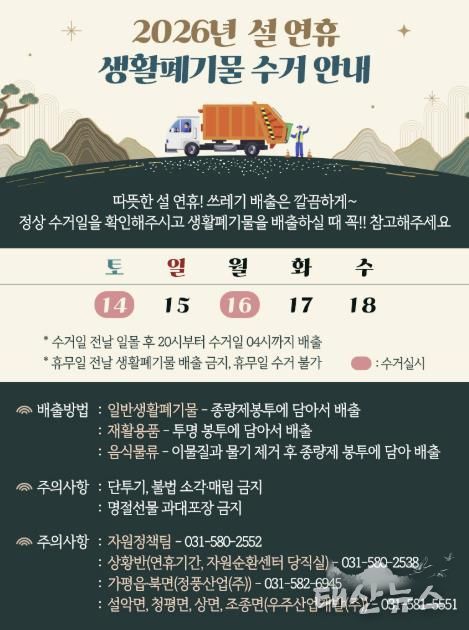 태산뉴스 이동욱 기자 | 가평군은 설 명절을 맞아 군민과 방문객 모두가 쾌적한 환경에서 청결한 연휴를 보낼 수 있도록 생활폐기물 처리 대책을 마련했다.
