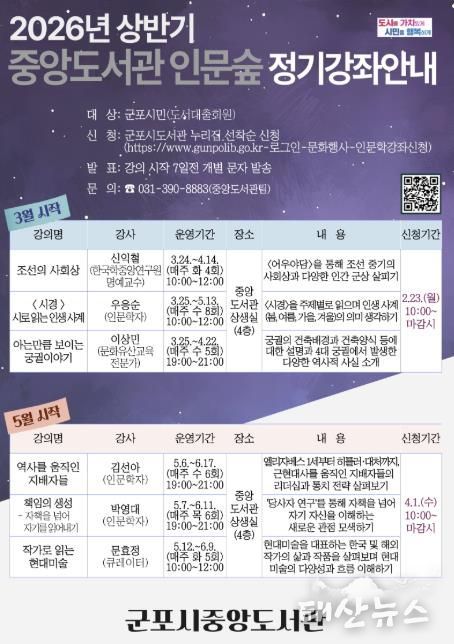 태산뉴스 이동욱 기자 | 군포시중앙도서관은 시민의 인문학적 소양을 함양하고 공동체적 성찰의 기회를 확대하고자 ‘중앙도서관 인문숲’ 상반기 강좌를 운영한다.