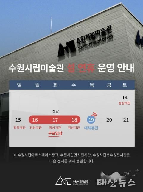 수원시립미술관 행궁 본관은 설 연휴 기간인 2월 15일부터 18일까지 정상 개방하며 설 당일인 2월 17일에는 무료 관람을 실시하며, 2월 19일에 대체 휴관한다.