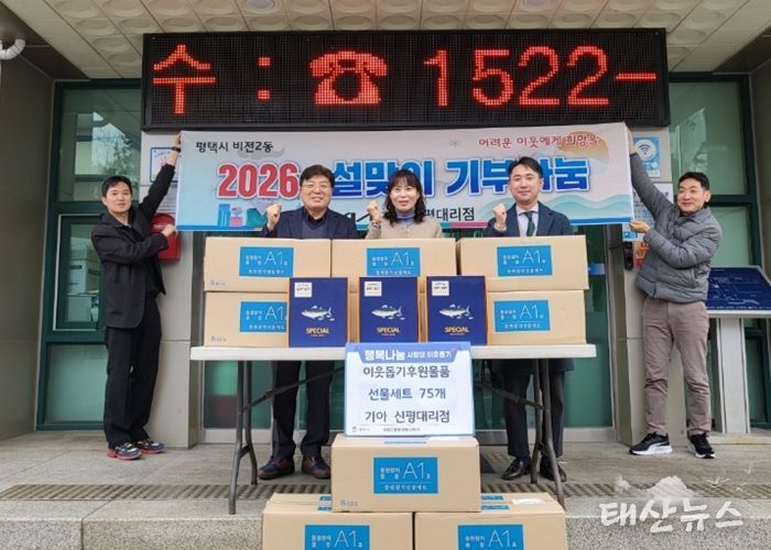 태산뉴스 이동욱 기자 | 기아 신평대리점은 10일 설 명절을 맞아 평택시 비전2동 행정복지센터에 지역 내 취약계층을 위한 명절 선물 세트 75박스를 기부했다.