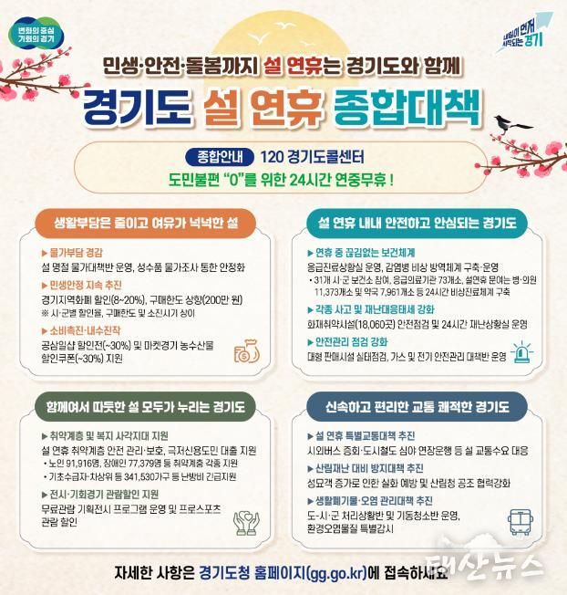 태산뉴스 김준수 기자 | 경기도가 도민들이 따뜻하고 편안한 명절을 보낼 수 있도록 ‘설 연휴 종합대책’을 추진한다.