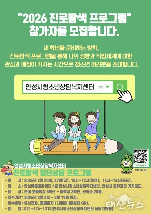 태산뉴스 이동욱 기자 | 안성시청소년상담복지센터는 오는 2월 20일과 27일, 2일간 청소년을 대상으로 ‘겨울방학 프로그램 – 진로탐색’을 운영한다고 밝혔다.
