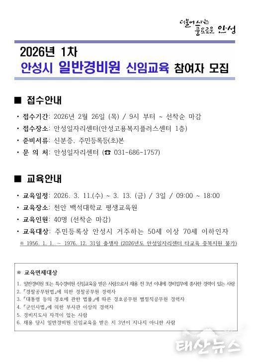 태산뉴스 이동욱 기자 | 안성시는 관내 구직자의 안정적인 일자리 창출을 위해 오는 2월 26일부터 '2026년 제1차 안성시 일반경비원 신임 교육' 교육생을 모집한다고 밝혔다.