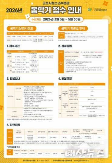 태산뉴스 이지율 기자 | (재)군포시청소년재단 군포시청소년수련관은 오는 2026년 3월 3일부터 5월 30일까지 ‘2026년 봄학기 문화체육 프로그램’을 운영하며, 2월 26일부터 신규 수강생 접수를 시작한다.