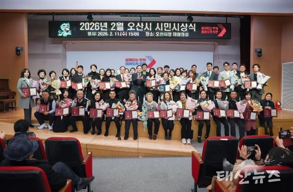 태산뉴스 김준수 기자 | 오산시는 지난 11일 오산시청 대회의실에서 ‘2026년 2월 시민시상식’을 개최하고, 지역사회 발전과 이웃사랑 실천에 기여한 시민 46명을 대상으로 표창을 수여했다.