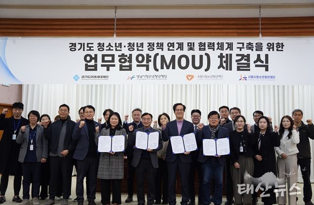 태산뉴스 이동욱 기자 | 수원시청소년청년재단은 2월 12일, 경기도미래세대재단, 성남시청소년청년재단, 시흥시청소년청년재단과 함께 ‘경기도 청년 정책 연계 및 협력체계 구축을 위한 업무협약’을 체결했다.