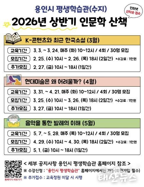 태산뉴스 이동욱 기자 | 용인특례시는 25일부터 수지구에 있는 용인시평생학습관에서 인문학 산책 수강생을 모집한다고 13일 밝혔다.