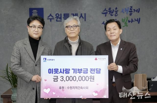 이웃돕기성금 300만 원은 수원지역건축사회 회원 137명이 모금해 마련했다. 수원지역건축사회는 2024년에도 이웃돕기성금 300만 원을 기부한 바 있다.