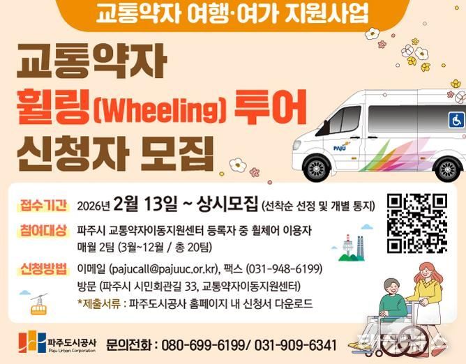 태산뉴스 이동욱 기자 | 파주시 교통약자이동지원센터는 교통약자의 이동권 확대와 여가 활동 증진을 위해 '교통약자 휠링(Wheeling) 투어 지원사업'을 3월부터 본격 운영한다고 밝혔다.
