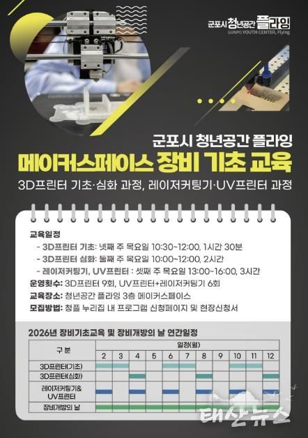 태산뉴스 이동욱 기자 | 청년공간 플라잉은 청년들의 제작 역량 강화와 안전한 장비 활용 환경 조성을 위해 장비 기초 안전교육과 장비개방의 날을 2026년 2월부터 12월까지 운영한다고 밝혔다.