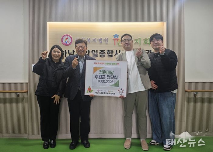 태산뉴스 이동욱 기자 | 어린이·청소년 교육 공연을 운영하는 전문업체 청춘마당은 지역 취약계층 지원을 위해 2월 11일 하남시감일종합사회복지관(사회복지법인 휴먼복지회 운영)에 후원금 1백만원을 전달했다.