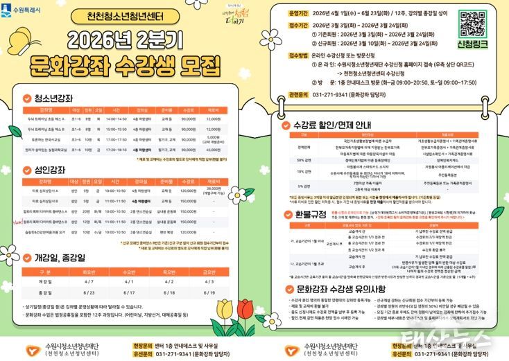 태산뉴스 이동욱 기자 | 수원시청소년청년재단 천천청소년청년센터는 지역 청소년 및 성인을 대상으로 하는 2분기 문화강좌 수강생을 모집한다고 밝혔다.