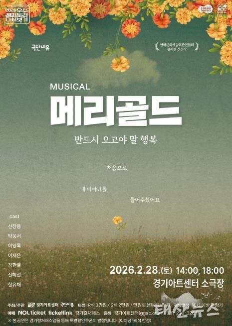 태산뉴스 김준수 기자 | 경기도와 경기아트센터는 오는 28일 오후 2시와 6시 경기아트센터 소극장에서 뮤지컬 ‘메리골드’ 공연을 선보인다.