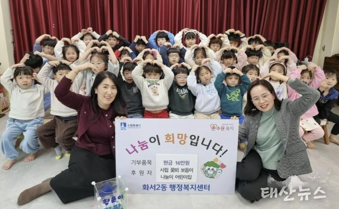 태산뉴스 이동욱 기자 | 수원시 팔달구 화서2동 소재 시립꽃뫼보듬이나눔이어린이집은 지난 23일, 원아와 학부모, 교직원이 함께 마련한 바자회 수익금 16만 원을 지역 내 어려운 이웃을 위해 사용해 달라며 화서2동 행정복지센터에 기탁했다.