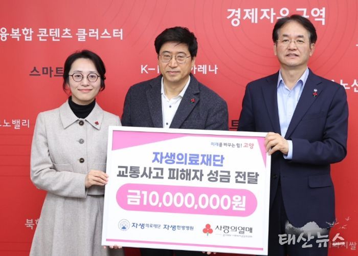 태산뉴스 이동욱 기자 | 고양특례시는 자생의료재단에서 교통사고 피해자 지원을 위해 써달라며 1천만 원을 기부해 지난 23일 자생의료재단과 전달식을 가졌다.