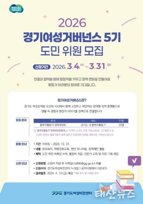 태산뉴스 김준수 기자 | 경기도여성비전센터가 2026년 ‘경기여성거버넌스’에서 활동할 도민위원을 오는 3월 31일까지 모집한다.