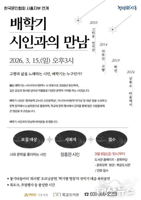 이번 만남은 3월 15일 오후 3시, 목감도서관 지하 1층 다목적실에서 진행되며, 시와 문학에 관심이 있는 50여 명의 시민과 함께한다. 시인이 직접 자신의 작품을 낭독하고, 시를 쓰게 된 계기와 창작 과정에 관한 이야기를 들려줄 예정이다. 또한, 시민들과 자유롭게 질문을 나누며 시와 삶에 대해 편안하게 대화하는 시간도 마련된다.